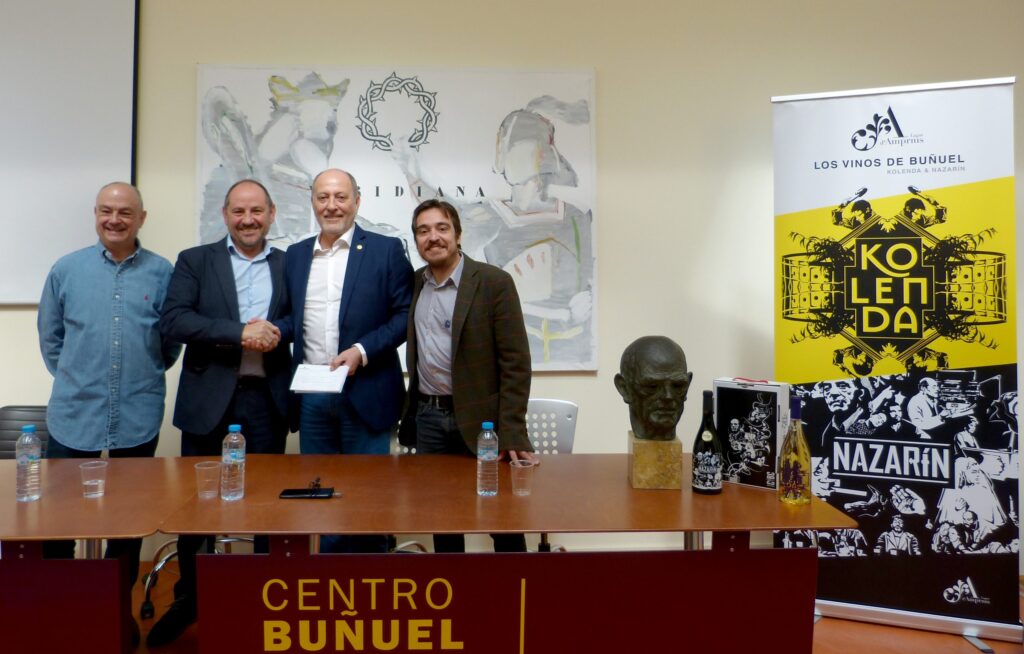 En el marco de la inauguración de la exposición “Tristana, una tipografía para Buñuel” celebrada el 23 de febrero en el Centro Buñuel Calanda, la bodega Amprius Lagar, del Grupo Térvalis, ha entregado 2.144 euros correspondientes a los recursos obtenidos tras la venta de 4.288 botellas de los Vinos de Buñuel en el último semestre de 2018 (ya se realizó una primera donación de 1.500 euros en julio). La donación ha tenido lugar en el CBC en presencia de Nacho Escuín, director general de Cultura y Patrimonio del Gobierno de Aragón, el presidente de la Fundación Centro Buñuel Calanda y alcalde de Calanda, José Ramón Ibáñez Blasco, Jordi Xifra, director del Centro Buñuel Calanda, y Pedro Casas, director gerente de Amprius.